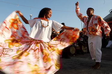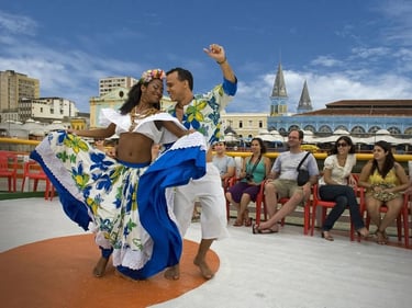 The music blends Indigenous, African, and Portuguese elements, creating a vibrant, percussive sound accompanied by banjos, tambourines, maracas, flutes, and rattles. Traditionally played in a circle, carimbó dance involves women wearing wide, flowing skirts and flowers in their hair, while men wear bright folkloric outfits. The performance often includes playful, flirtatious movements — such as a woman tossing her skirt over a male dancer’s head — and tells stories about the jungle, the river, and local traditions.